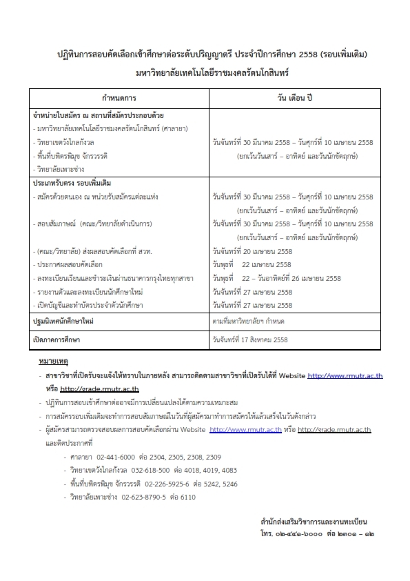 ปฏิทินการสอบคัดเลือกเข้าศึกษาต่อระดับปริญญาตรี ประจำปีการศึกษา 2558 (รอบเพิ่มเติม)