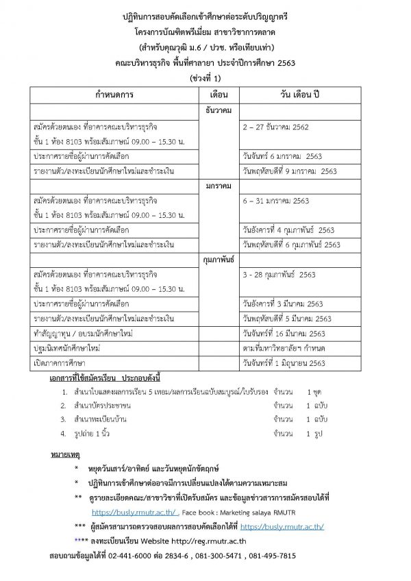 ปฏิทินการสอบคัดเลือกเข้าศึกษาต่อระดับปริญญาตรี โครงการบัณฑิตพรีเมี่ยม สาขาวิชาการตลาด