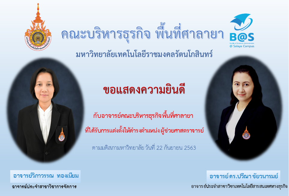 ขอแสดงความยินดีกับ อาจารย์วิภาวรรณ ทองเนียม อาจารย์ประจำสาขาวิชาการจัดการ และ อาจารย์ดร.ปวีณา ชัยวนารมย์ สาขาวิชาเทคโนโลยีสารสนเทศทางธุรกิจ พื้นที่ศาลายา ที่ได้รับการแต่งตั้งให้ดำรงตำแหน่ง ผู้ช่วยศาสตราจารย์