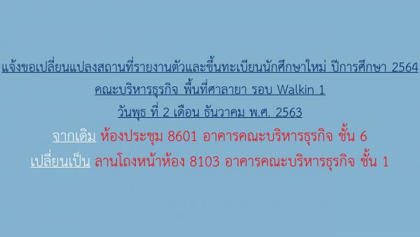 แจ้งเปลี่ยนแปลงสถานที่รายงานตัวและขึ้นทะเบียนนักศึกษาใหม่ ปีการศึกษา 2564 ในวันพุธที่ 2 ธันวาคม 2563