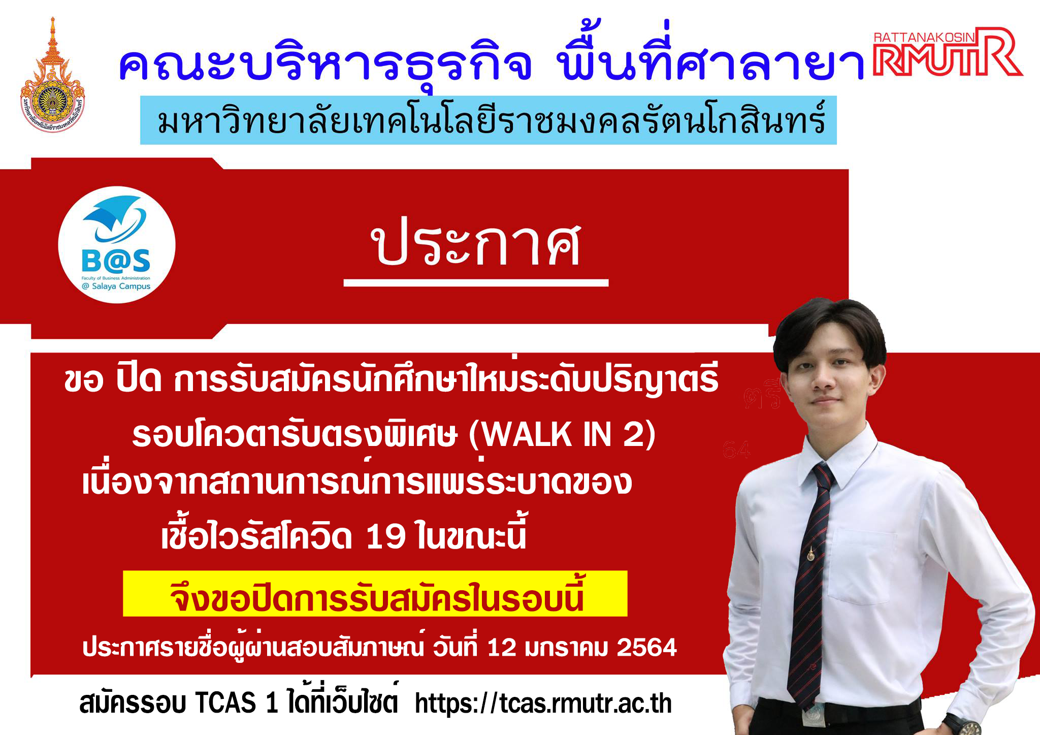 ขอปิดการรับสมัครนักศึกษาใหม่ระดับปริญญาตรี รอบโควต้ารับตรงพิเศษ (WALK IN 2)