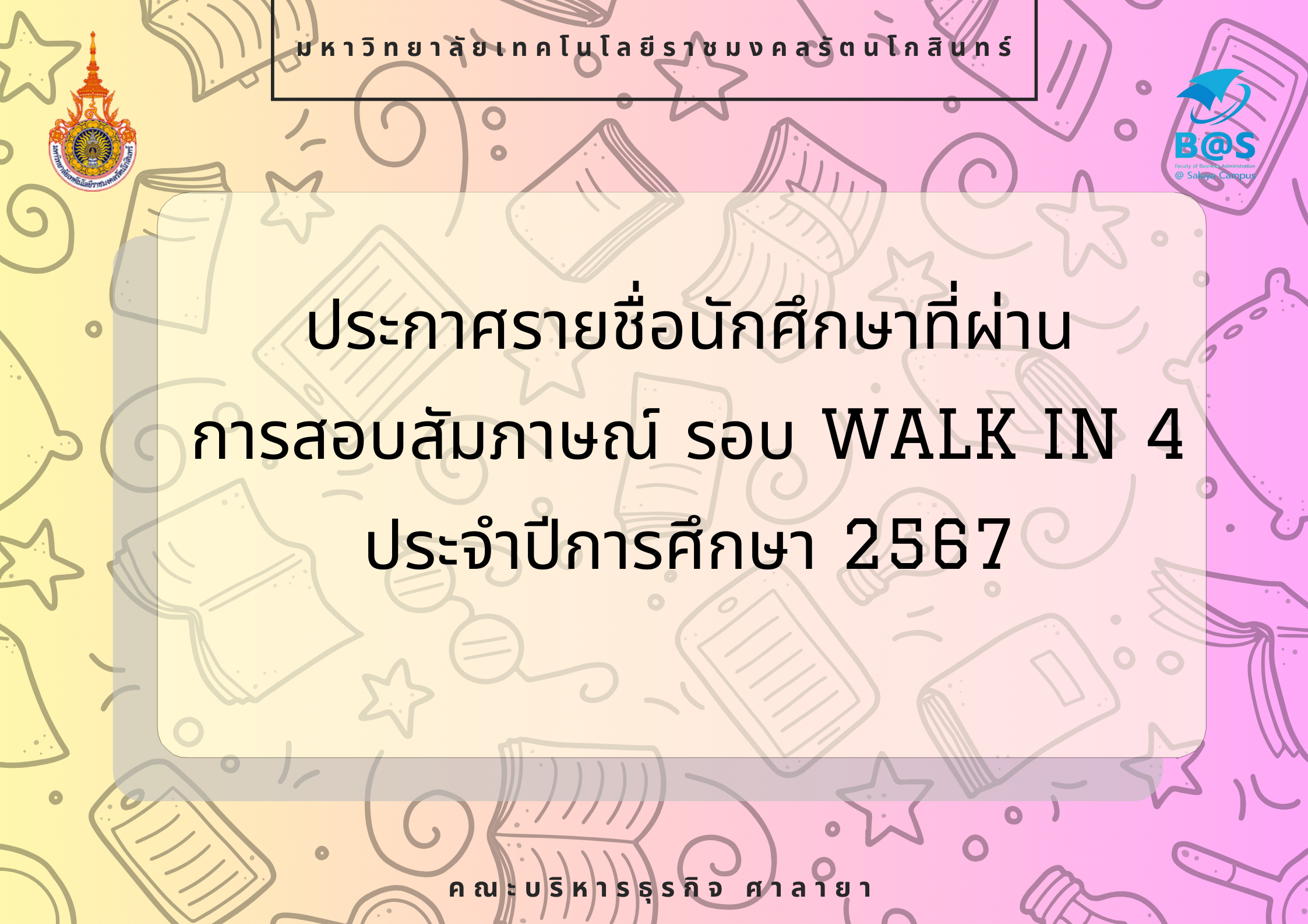 ประกาศรายชื่อผู้ผ่านการคัดเลือกเข้าศึกษาต่อระดับปริญญาตรี ประจำปีการศึกษา 2567 รอบ Walkin 4